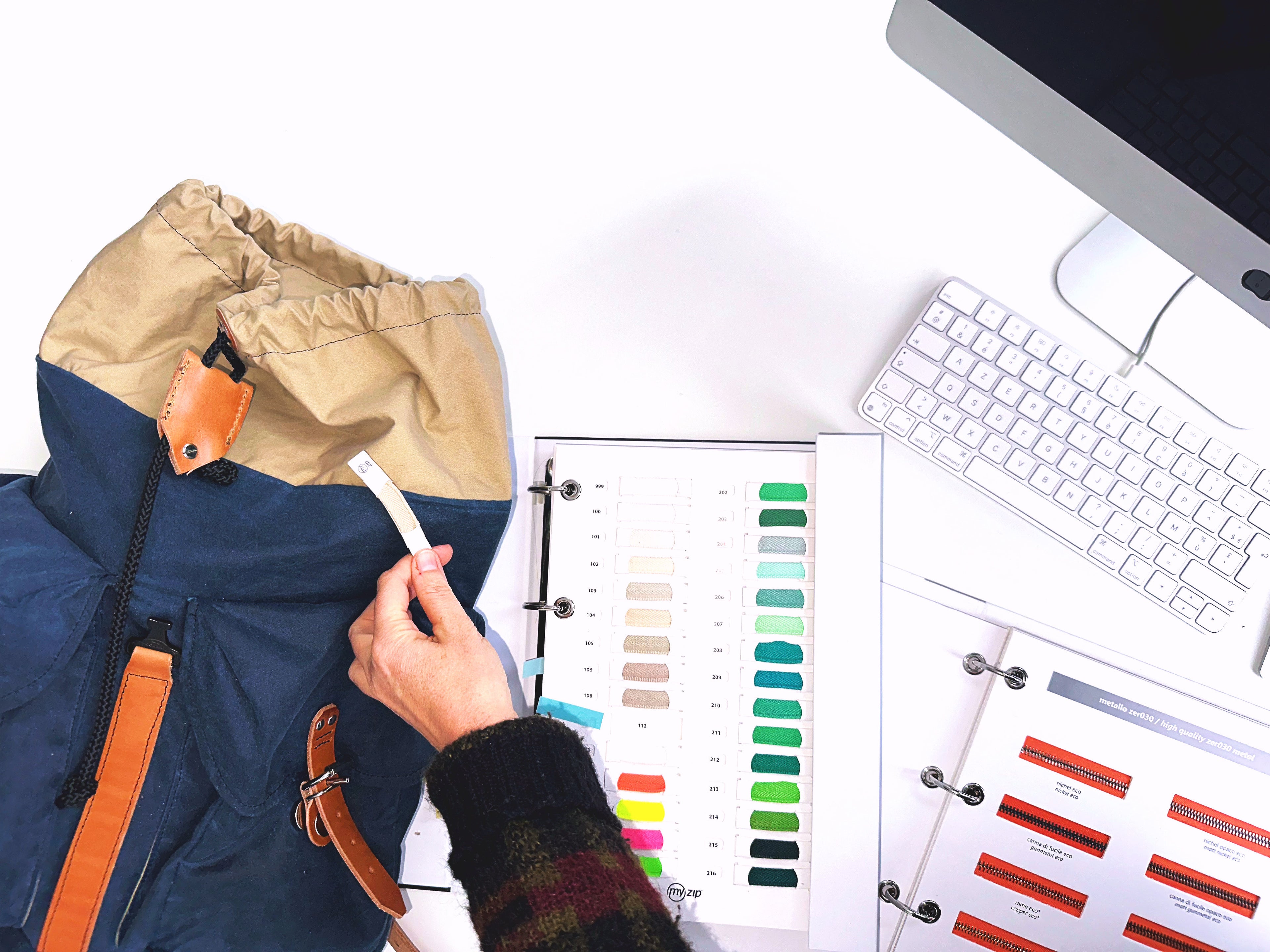 Nos matières sont sélectionnées avec exigence : cuir tanné végétal, toiles tissées en France avec traitement non toxique, coton biologique certifié, laine recyclée des Pyrénées. Lorsque la durabilité l’exige, nous intégrons également des composants recyclés, jusque dans nos emballages en papier certifié FSC®.
