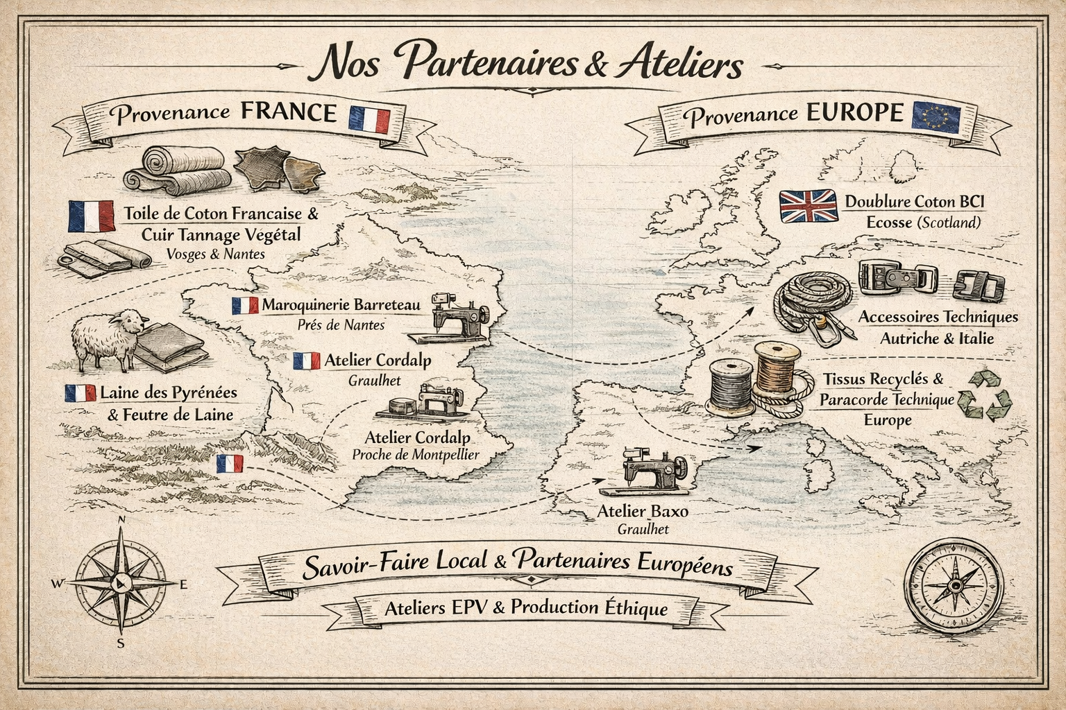 De nos ateliers de fabrication à nos fournisseurs de matières et composants, chaque point reflète un engagement commun : qualité, proximité et durabilité.